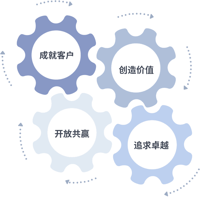 成就客户是一切决策的出发点,,,创造价值是衡量所有工作的标准,,,,追求卓越是我们做事做人的态度,,,,开放共赢是我们的格局也是最终的结果。。。。价值观的齿轮环环相扣,,推动着组织里的每个人不断向前。。。。